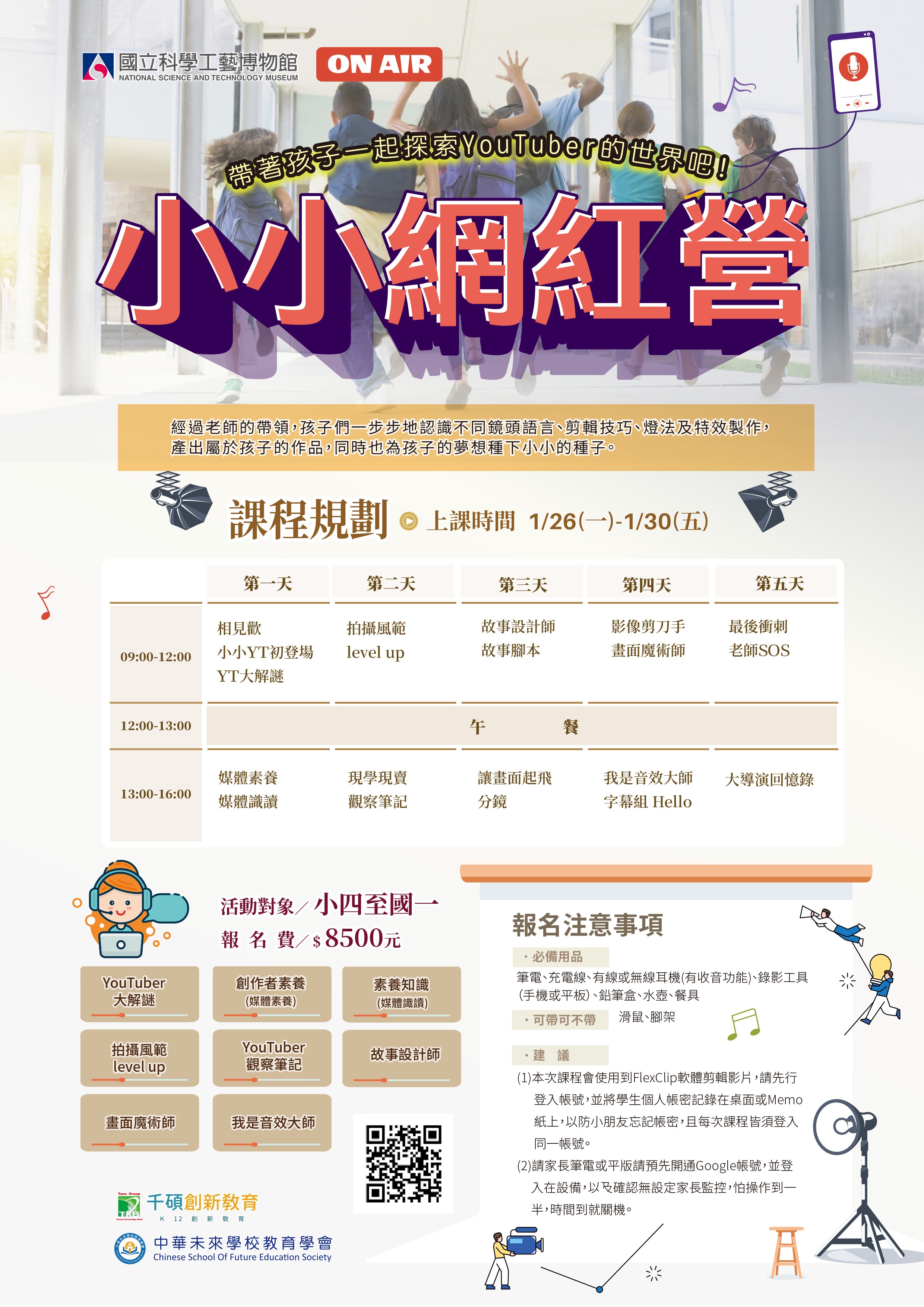 報名方式 一、網路報名:網址https://serv.nstm.gov.tw。登入本館會員後,進行報名。(請使用參加學員資料進行報名,勿使用家長資料)