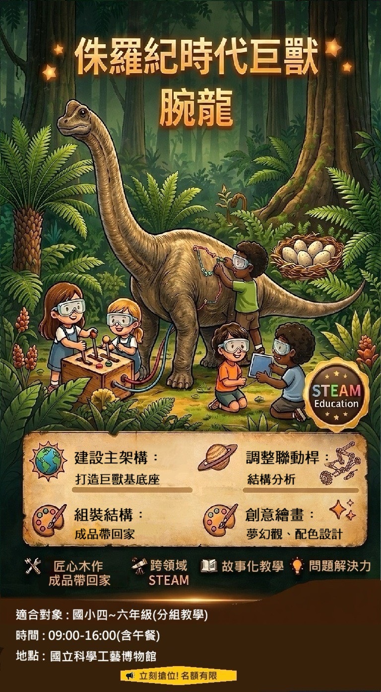 為什麼腕龍擁有細長的脖子卻能保持平衡?巨大的身軀是如何移動的? 這是一場跨越時空的工程對話。我們將帶領學員從生物結構的角度出發,觀察史前巨獸的骨骼比例,並將其轉化為機械語彙。